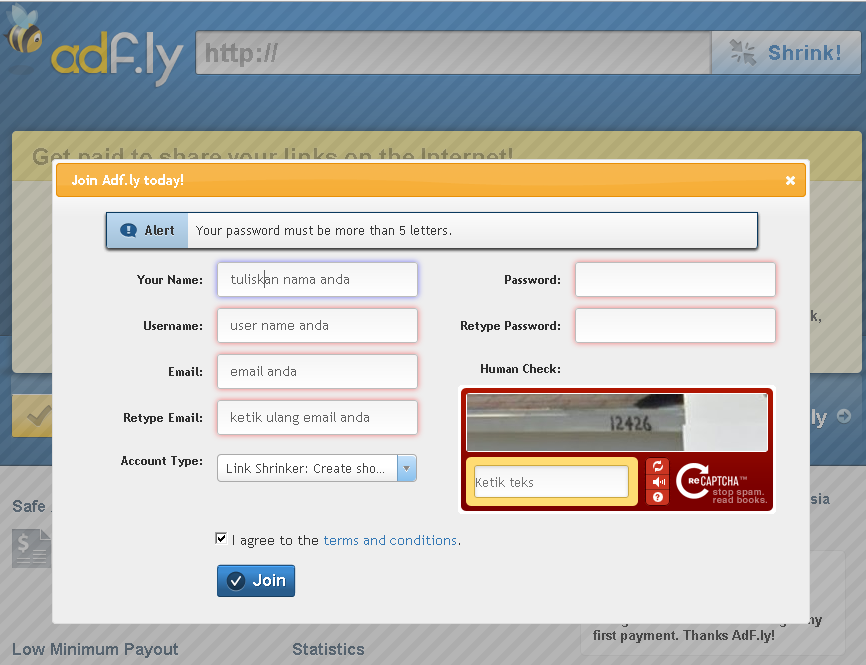Form diatas ada gambar formulir pendaftaran untuk adf.ly lengkapi semua data yang diminta, setelah lengkap lalu klik tombol Join.